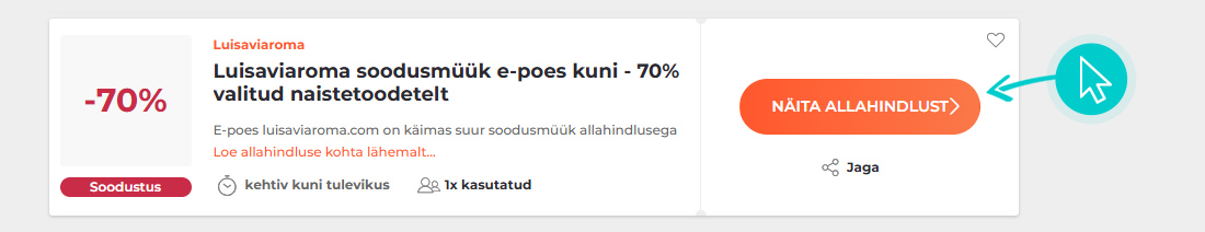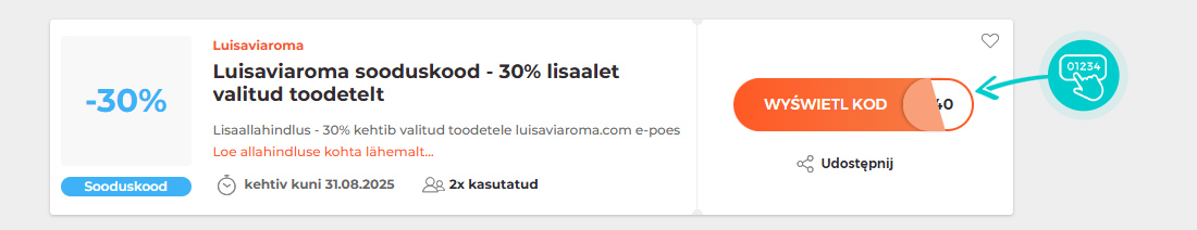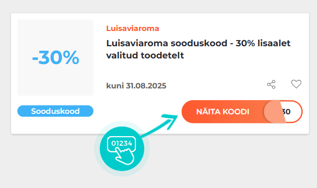 Valige meie veebilehelt konkreetne sooduskood, mida soovite Luisaviaroma e-poes kasutada. Klikkige oranži „Näita koodi“ nuppu.