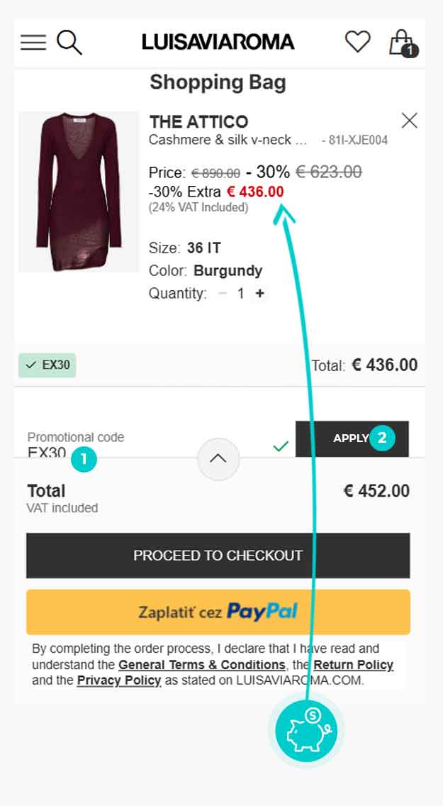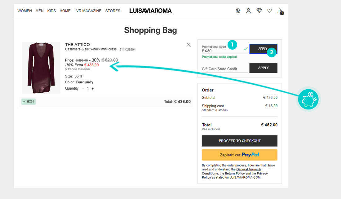 Valige e-poes Luisaviaroma.com toode, mis teile huvi pakub, vajutage „Lisa ostukorvi“ nuppu ning toode lisatakse automaatselt ostukorvi. Ostukorvist leiate „Sisesta sooduskood“ välja, kuhu saate sooduskoodi kleepida või kirjutada. Kinnitage see „Sisesta“ nupuga.